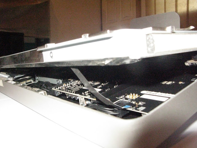 Procedure :- To retro-fit a 2.5” SSD in place of the 3.5” HDD in the 2009 iMac 27", I would first clone the HDD to the SSD with Carbon Copy Cloner or SuperDuper! and, with an abundance of caution, bench-test the clone as an external for a day or two to ensure that it is glitch-free. Then, I would remove the RAM door and memory cards and with appropriate suction cups, lift the front glass of its magnets, mask the glass, unscrew the torxs' holding down the LG panel and raise the fragile Korean just enough to unplug her Vertical Sync plug on the upper left.